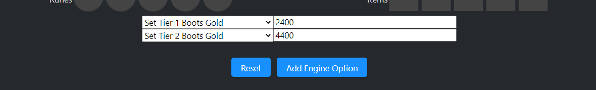 This is good but we think the boots are in the wrong place. Let's change that by using the Add Engine Option button. We can add two engine options, Set Tier 1 Boots Gold and Set Tier 2 Boots Gold to move the boots into the correct position.